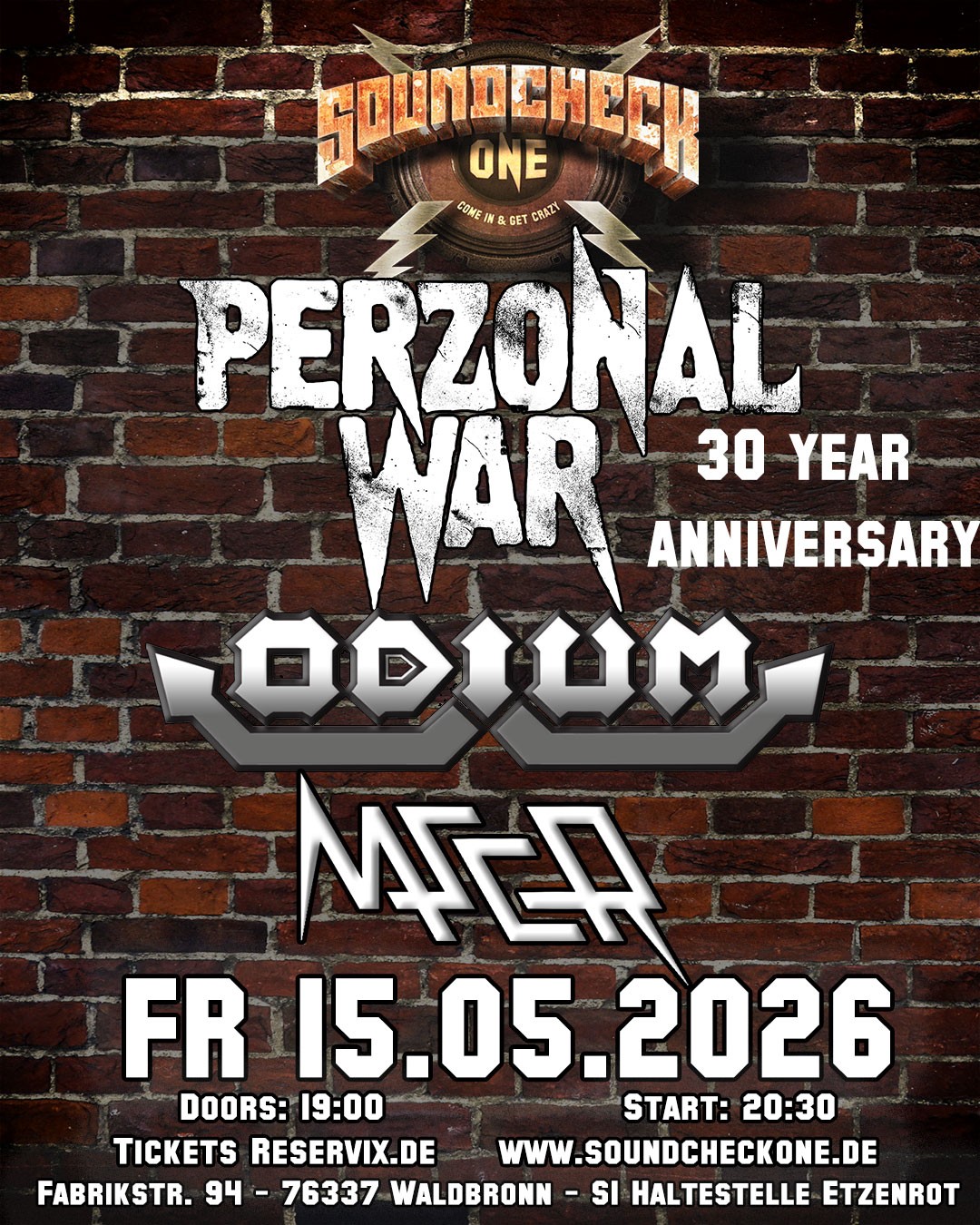 On Friday, May 15, 2026, we're kicking off a massive metal night at Soundcheck One in Waldbronn. PERZONAL WAR will be there with a 30th anniversary show and will be joined by ODIUM from Frankfurt.
